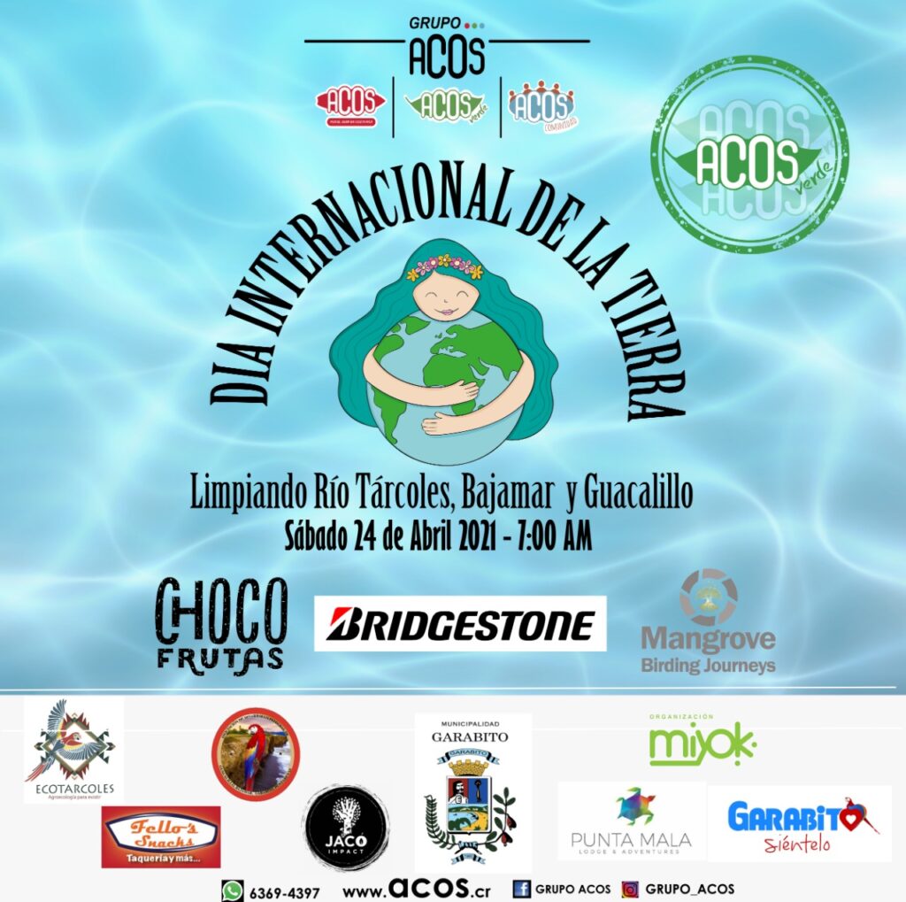 En el marco de esta celebración, Grupo ACOS en conjunto con Bridgestone Costa Rica, Chocofrutas y Mangrove Birding Journeys dentro de los principales actores y la Municipalidad de Garabito estaremos limpiando el Río Tárcoles de llantas. Adicional a esto y junto con la colaboración de diversas empresas privadas y organizaciones comunales se encargarán de impactar las playas de Tárcoles, Guacalillo y Bajamar.